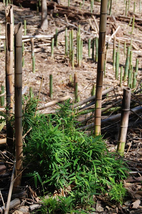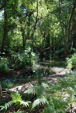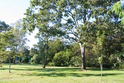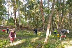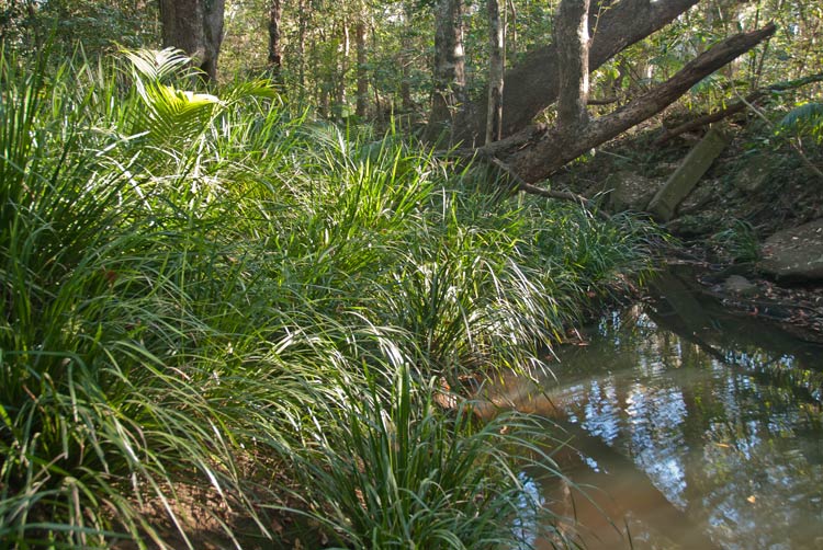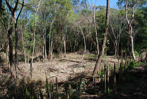 However, Chinese elm, camphor laurel and other bird dispersed weed species have invaded the area. Bamboo appeared some years ago and has since spread rampantly over a grassy embankment into the forest.