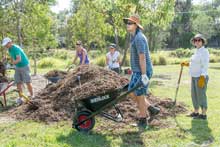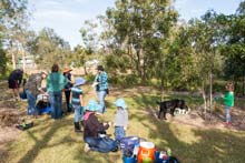 Habitat Brisbane Officer Fleur Sanderson and Marion Goward (MOTT) coordinated the overall activity in support of Annie Morris, local group contact at Keperra, who brought together an enthusuastic group of volunteers from the local community. One particular feature of that morning was the attendance of a significant number of young children assisting their parents. These children beavered away happily and even the youngest had an enjoyable contact with nature. Morning tea followed a swift cleanup after the group ran out of mulch. Even so, virtually all of the trees received adequate mulch close to each tree trunk.