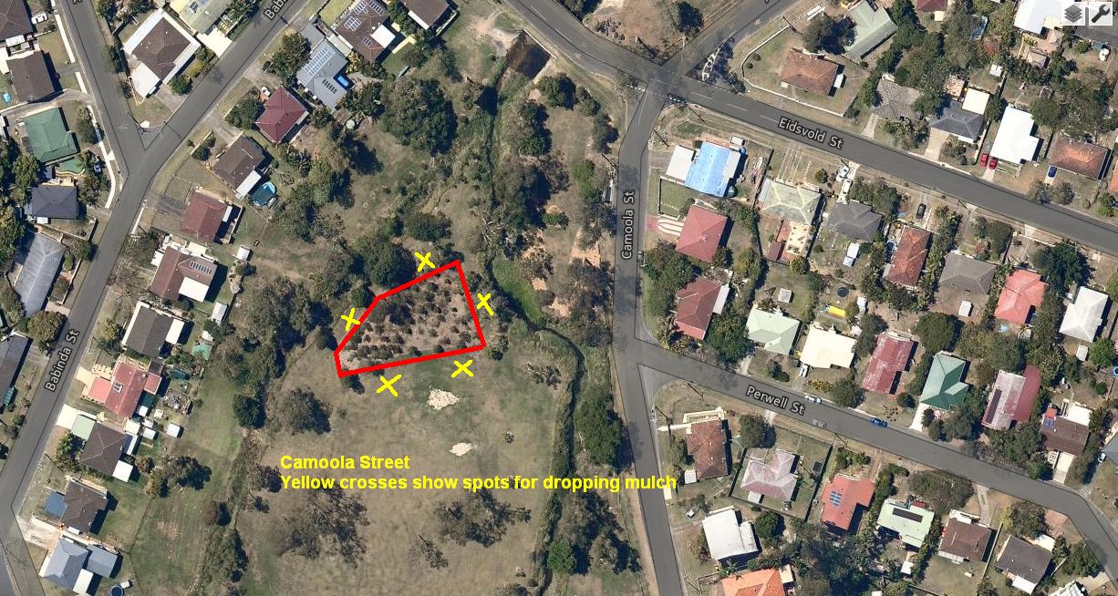 This local group recently worked on a community activity assisted by Men of the Trees (MOTT) at Camoola Street Park on Saturday 26 October 2013 between 8 am to 10 am. The main activity involved the covering of a large area with mulch. Details about the location of and the area of this mulching in the Park can be seen in a small map indicating an area of young trees planted some years ago. Over recent years, this area had suffered from strong winds and some flooding so a significant number of these trees had eroded soil at ground level and were standing awkwardly at various angles. Later work by BCC contractors repaired most of the damage by fixing temporary stays to support the weakest trees from falling over.