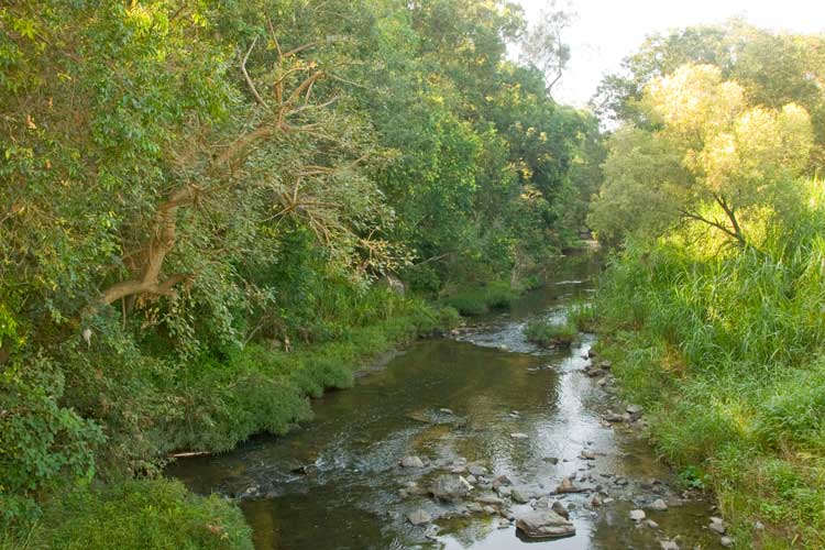 Steep hills adjacent to the northern bank of Kedron Brook support a Eucalypt open forest that has probably regenerated since settlement. The forest understorey in this area is sparse and weedy. Ground hollows are associated with steep banks and rocky outcrops. Eastern water dragons are abundant and are frequently seen sunning themselves on the Creek bank.