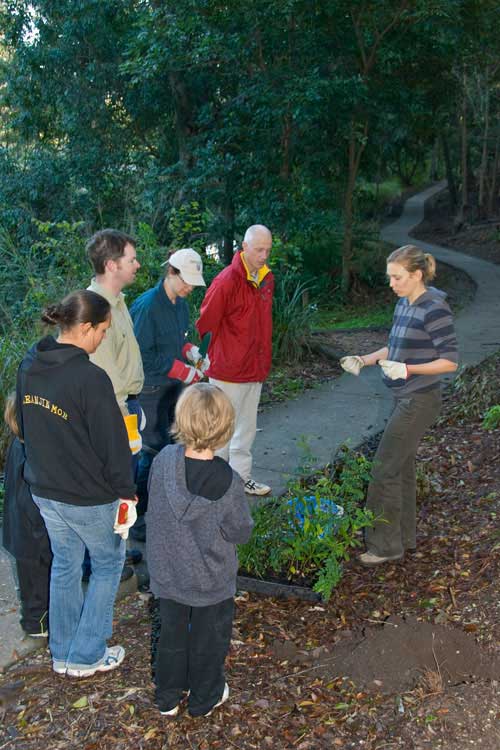 | Creek Ranger Anna Bourke shows the correct planting techniques to volunteers (21 August 2010) |