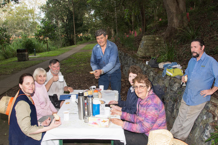 | Habitat Brisbane Officer Fleur Sanderson (left) enjoys a social break with the group at end of their weeding and planting activity (21 June 2014) |