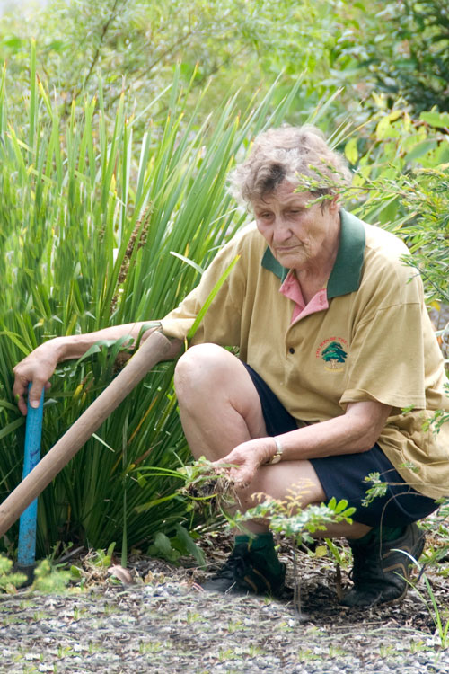 | Fran Gilje, in March 2011, weeding one of the revegetation plots set up in August 2009 at the Keperra Picnic Grounds |