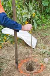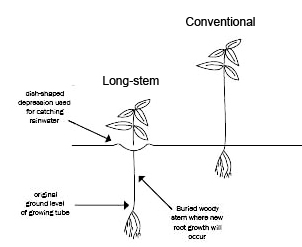 The long-stem planting method is an innovative way of planting that can result in higher survival and growth rates with minimal post-planting care. With the use of the long-stem method, seedlings are grown in pots for 10-18 months, so that they develop long woody stems. These seedlings are then planted with about three-quarters of their length below the soil surface, approximately one metre deep, which results in much of the woody stem being covered with soil. (See the diagram right). The deep planting protects the roots from substantial changes in soil temperature, allows the plant access to deeper soil moisture and reduces competition from weeds.