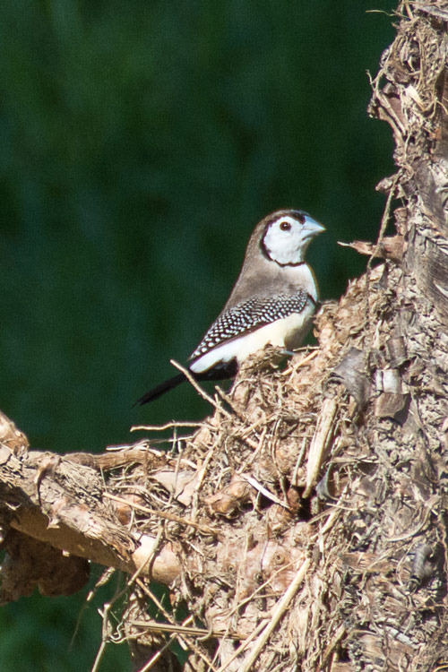 Double-barred Finch seen exploring a tree trunk during bird survey at Grange Forest Park
