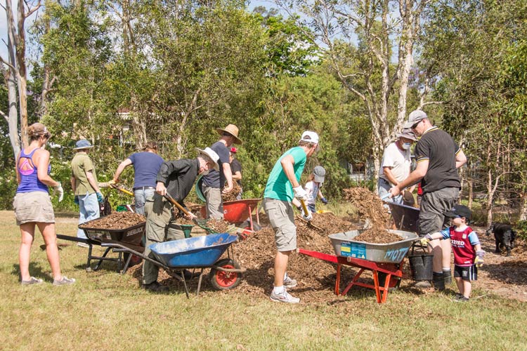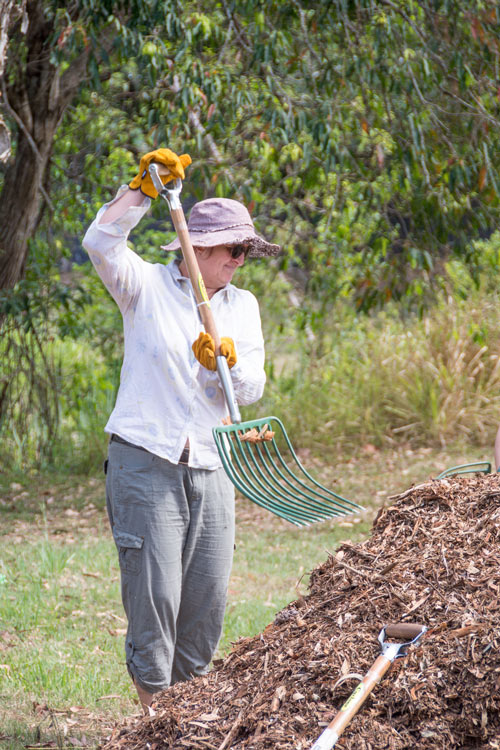 Local group contact leader, Annie Morris, sets a fine example loading the mulch at the Camoola Street Park activity