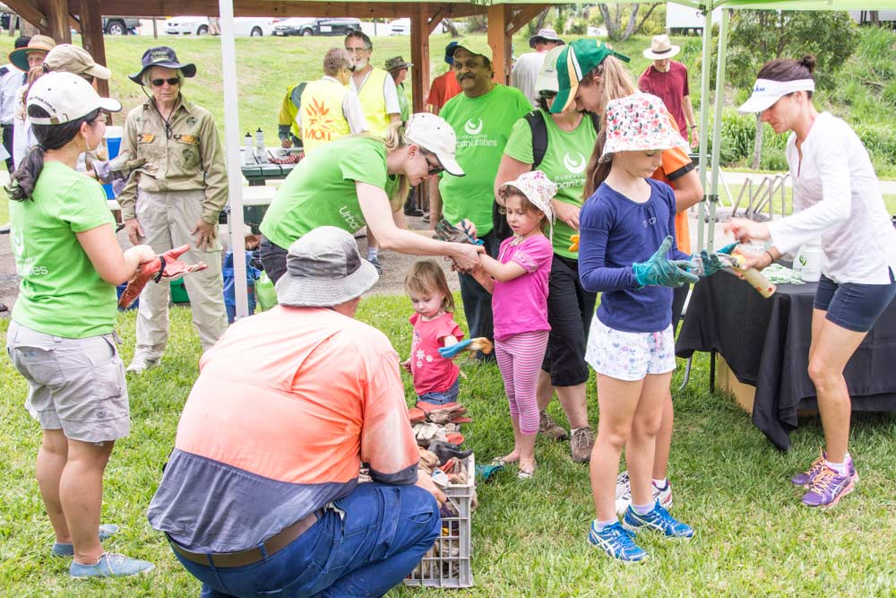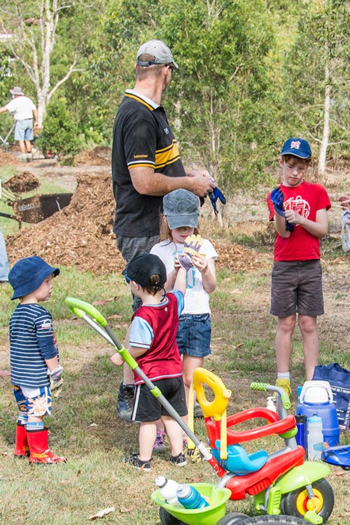 Young children at the QUU activity are helped to wear the proper hand protection before they are allowed to plant (23 November 2013) |