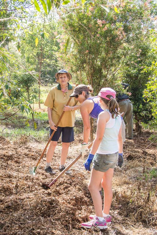 Men of the Trees member, Fran Gelje, guides some young helpers with the spreading of mulch at Camoola Street Park on 20 October 2013 |