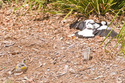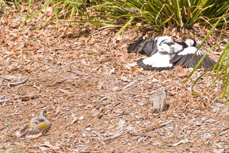 On the way back to near the playground at Grinstead Park, we noticed an Australian Magpie anting itself in the loose mulch. This was despite three Noisy Minors that turned up, not to dispatch the magpie away as usual, but to join in the mulch-rolling activity in warm sunshine together.